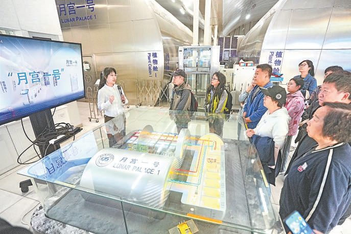 观众在“月宫一号”科普基地聆听讲解。 北京日报记者 和冠欣摄