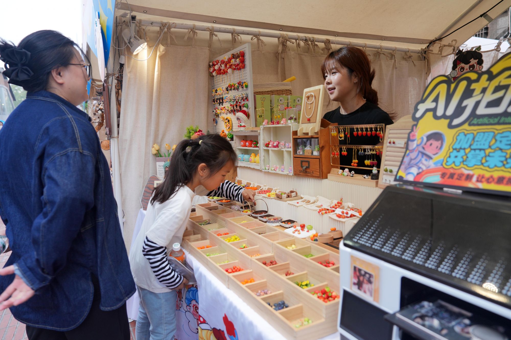 主办方精心策划的多场文化活动,更带来不同玩法。“我们为大家准备了乐队现场演唱经典影视歌曲,还有载歌载舞的彝族民俗巡游,以及中戏偶剧社团巡游、坝河打水漂大赛等活动。”市集相关负责人宋芳雪介绍,他们还请来刘美含、管乐、闫佩伦等艺人担任“一日店长”,与观众互动。“闫佩伦直接把现场变成了签售会,刘美含和管乐3小时也收获了不错的销售额。他们的销售额都会被用来扶持电影人。”