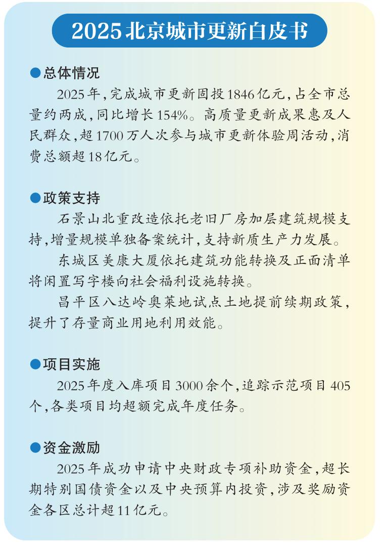 白皮书披露的数据显示,2025年北京城市更新固定资产投资达1846亿元,占全市固投总量约两成,同比增长154%,已成为扩内需、稳增长的重要抓手。与此同时,超1700万人次参与了城市更新体验周活动,带动消费总额超18亿元。