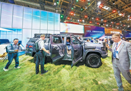 北汽集团展区展示的新款越野皮卡车,吸引众多观众参观。