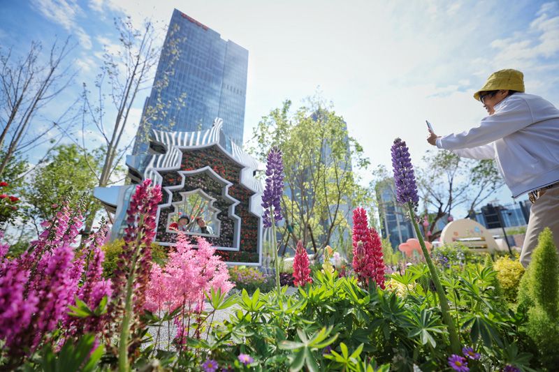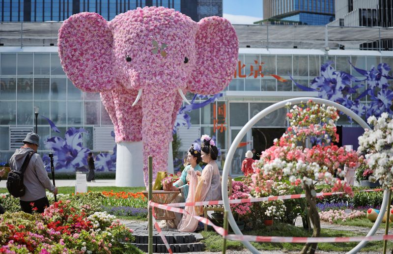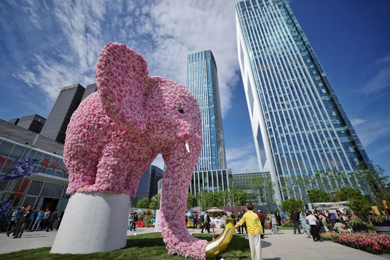4月28日,2026北京国际花展在丰台区丽泽金融商务区开幕。7米高的花艺装置“太平有象”将浪漫氛围拉满。