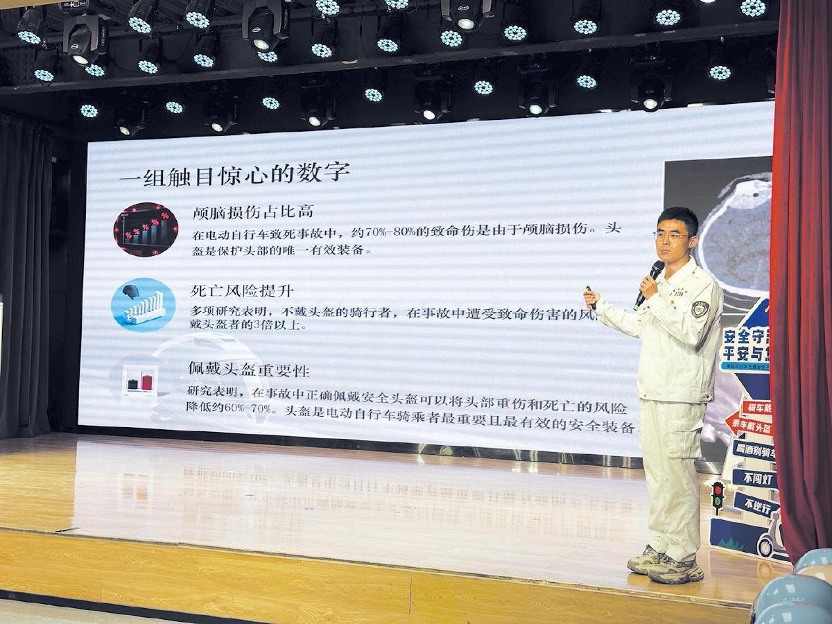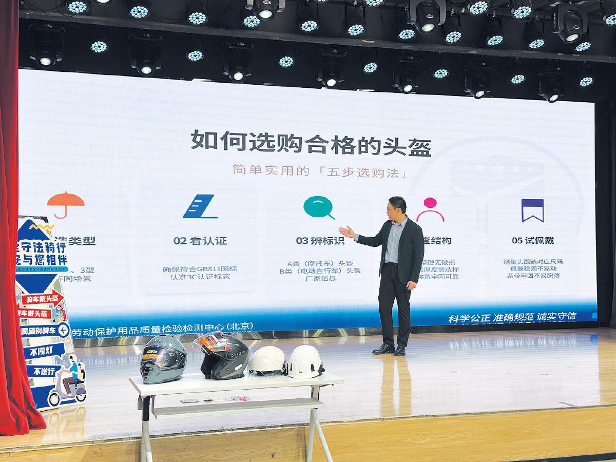 北京市交通安全宣传教育基地讲师姚新辰以“规范骑行 平安出行”为主题,从骑行前如何正确佩戴安全头盔、检查车辆状态,到骑行时保持专注、正确操作,并做好应对突发情况的准备进行讲解。