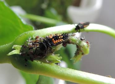 1周之后,王俊侠和侯峥嵘再次来到了刘民的辣椒棚,辣椒花上的蓟马明显减少了,从1周之前的10多头下降到了3、4头,轻轻的拨动花就能发现里面隐藏的小花蝽爬出来。有些叶片上也能看见小花蝽在捕食蓟马。刘民高兴的说:“没想到这小花蝽看着不起眼,还真把蓟马给治住了!”不过他接着说,蓟马是治住了,可是棚南头的辣椒上又出现了蚜虫和棉铃虫危害。侯峥嵘告诉他不用担心,市植保站现在对付这些害虫都有天敌,瓢虫防治可以防蚜虫,赤眼蜂能防棉铃虫等鳞翅目害虫。