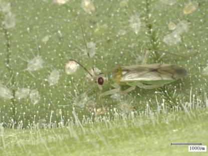 王俊侠很快就想到了帮助刘民的办法。原来,北京市植物保护站今年重点推广应用的天敌昆虫—东亚小花蝽正是蓟马的克星。王俊侠立即联系了市植保站生物防治科的高级农艺师侯峥嵘,他们带着天敌产品小花蝽一起来到了刘民的辣椒棚。侯峥嵘为刘民讲解了东亚小花蝽的防治特点和用法,之后在棚室内按照每平米2头的用量释放了小花蝽。