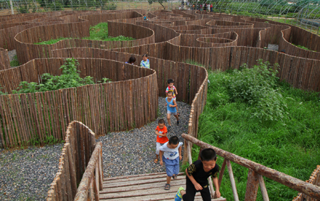 在迷宫里,一群孩子正开心地相互比赛,一个个从进口争相往出口方向,一边探寻,一边奔跑。据介绍,这些孩子都来自附近村庄,这里每天都是他们游玩的好去处。