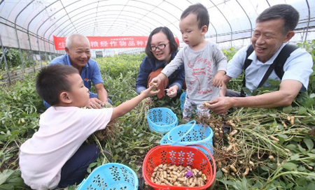 时值九月金秋,正是丰收的季节,火红的高粱、饱满的谷子和花生给休闲农业带来了商机,其中花生采摘活动是本市众多休闲农庄的首选项目。9月25日,北京市种子管理站在顺义区的花生示范点——北京野谷健康产业有限公司生态园区,组织开展了一次面对市民的花生采摘体验活动。大约有20人参加了此次体验活动,有老人,有家长,有孩童。生态园区内,黄绿色的花生叶子长势喜人,一个带孩子的老人正低头顺着花生的叶脉往起拔,旁边的小孩手舞足蹈,急切的等着摘取。拔下了的植株上的花生,被嫩嫩的小手逐一取下。孩子们边摘边往嘴里送,且不忘相互交流,交流彼此收获的花生果实——比比谁摘到的更好吃。