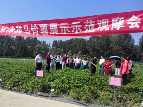 为了加大新品种的宣传推广力度,2017年6月29日,北京市区种子管理机构、马铃薯种植户、企业代表等单位举办了一场马铃薯新品种现场观摩及产品品尝会。针对不同用途马铃薯品种,观摩会上特别制作了不同加工食品供参观人员品尝。其中有淀粉含量高的适宜制作全粉面粉、面包、馒头的品种大西洋等,加工的面包、馒头口感清香;有适宜制作炸薯条、炸薯片的品种中薯10号、夏波蒂等,加工的薯条焦脆可口;有适宜制作饮料的品种红玫瑰、5p-40等,加工的饮料口感醇厚。这些食品类型丰富、口感美味,得到参观人员的好评。同时,利用不同马铃薯品种做成了一桌丰盛的土豆宴,发挥各类型马铃薯的特点,集成了美味特色的土豆大餐。这场观摩会不仅展示了马铃薯优良品种,更让种植户清晰地了解马铃薯的各种功能和用途,为优良品种的应用推广奠定基础。