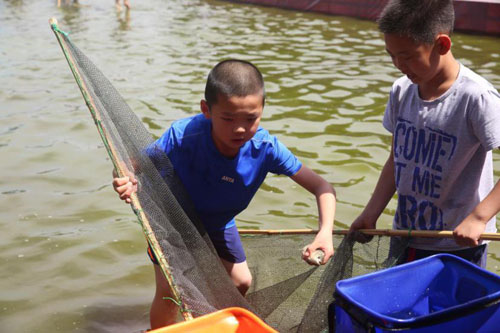 记者在活动现场看到,在黑庄户教辅中心操场内2个近800平米的捕鱼池内,孩子们体验了6种捕鱼的方式,学习捕鱼的方法,体验捕鱼的快乐。有摸鱼、抄鱼、拉网捕鱼、撒网捕鱼、大搬筝网捕鱼、端网捕鱼等。同学们以小组为单位,分工合作,群策群力,各显身手,有细心观察、思考的安静,有大获成功的欢呼雀跃,各种声音汇合成一支美妙动听的“鱼乐交响曲”。