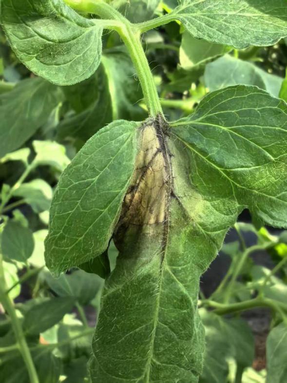 下部叶尖/叶缘先遭殃,初期是无明显边界的暗绿色水浸状斑,向叶柄延伸坏死呈V型,潮湿时叶背边缘窜出白霉,干燥后病斑变褐干枯。