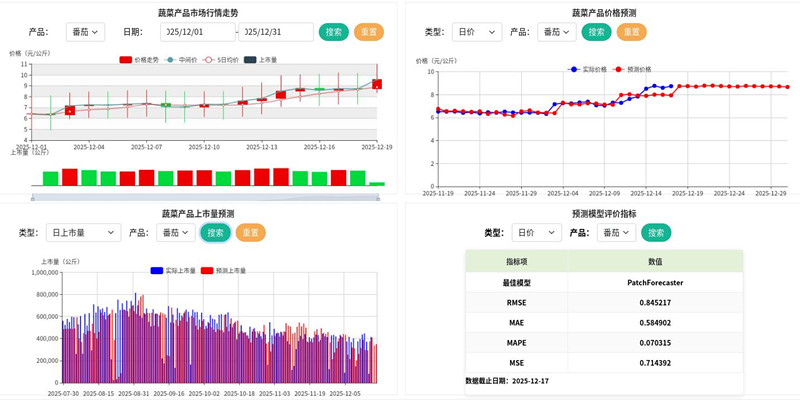 自2025年以来,北京市数字农业农村促进中心以科技项目为重要抓手,聚焦蔬菜产业高质量发展,在提升预测预警服务能力方面取得了阶段性的成效。一是数据监测范围有序拓展。将北京鲜活农产品流通中心(黑庄户市场)纳入批发市场监测,年内新增的30家环京基地纳入蔬菜产地监测,增加新发地种业市场8家农资销售商户为农资价格监测点;全年监测蔬菜产销数据60多万条。二是预测预警技术不断突破。研究构建了反映京津冀蔬菜产销情况的系列指数;利用深度学习技术建立了蔬菜价格预测模型和异常波动识别模型,定期完成54种蔬菜未来14天、未来4周、未来3个月价格预测及风险预警;通过数据分析摸清了河北、山东、内蒙等主产区蔬菜茬口和上市时间分布;累计完成各类分析预测报告72篇。三是信息服务模式开拓创新。开通“数说市场”直播服务,主打“菜篮子”微信号服务,通过多种渠道引导农业生产经营主体准确把握市场、更好应对市场。“数说市场”直播已完成12期,累计38816人次收看,“菜篮子”微信号用户规模突破16000人。四是市场信息引导蔬菜结构调整打开局面。分析提出《基于市场信息引导蔬菜生产结构调整的建议》,明确了北京地产蔬菜7大主导产品及20个优势茬口;在12个区、19个乡镇、22个示范点进行试点示范,针对主导蔬菜产品的关键茬口制作了服务手册,包括蔬菜历史价格走势、高低价时段分布、10大主产区及上市时间分布、市场行情预测等内容,并通过京东、中国邮政、美团等渠道为示范点开展产销对接服务。各示范区主导蔬菜产品和优势茬口均有不同程度的稳定和强化。(供稿:北京市农业农村宣传中心)