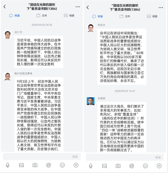 读书活动还在火热持续中,目前委员们共发言800余条,实现了线上线下同频共振、学习交流入脑入心的良好效果。委员们的发言发自肺腑、接力持续,读书群中洋溢着庄严与激情、思考与担当。通过交流,委员们更加深刻地认识到中国人民抗日战争的伟大胜利是中华民族从近代以来陷入深重危机走向伟大复兴的历史转折点,新时代取得的伟大成就,是党和人民一道拼出来、干出来、奋斗出来的。大家一致表示,要更加紧密地团结在以习近平同志为核心的中共中央周围,深刻把握中国式现代化这一最大的政治,将学习激发的热情转化为履职尽责的实际行动,广泛凝聚人心、凝聚共识、凝聚智慧、凝聚力量,画好团结奋斗的最大同心圆,聚焦新时代首都发展,为强国建设、民族复兴贡献更多政协智慧与力量。