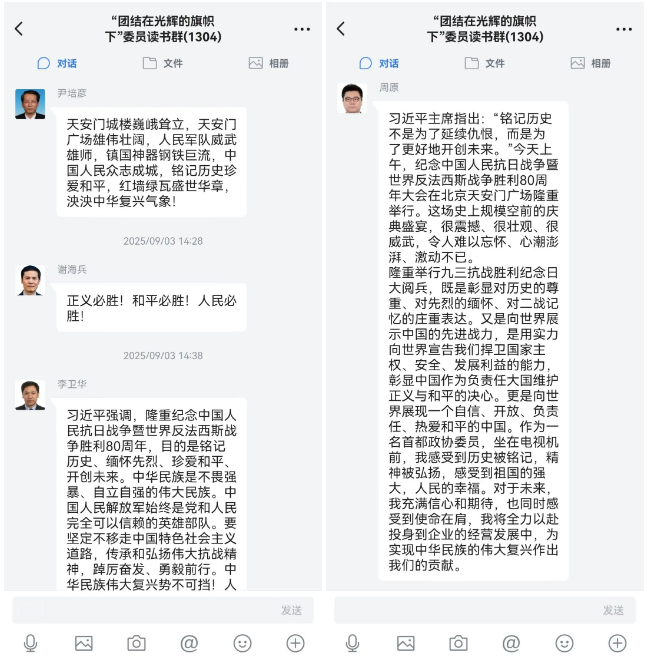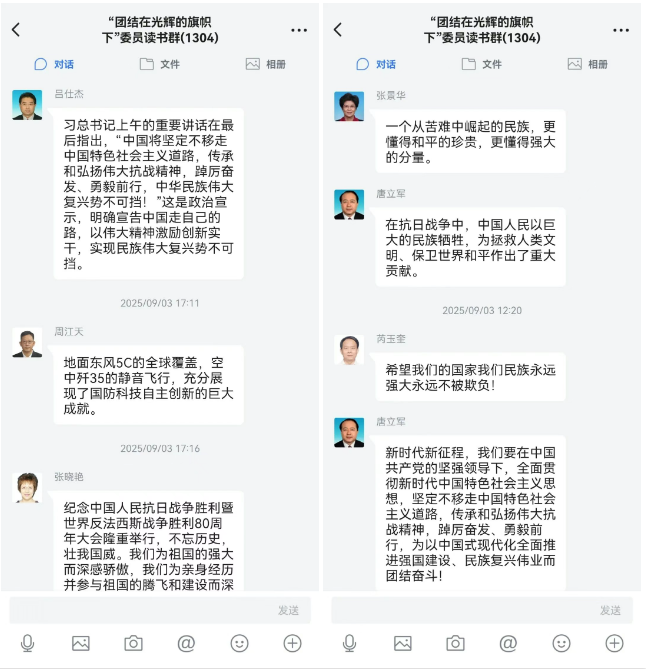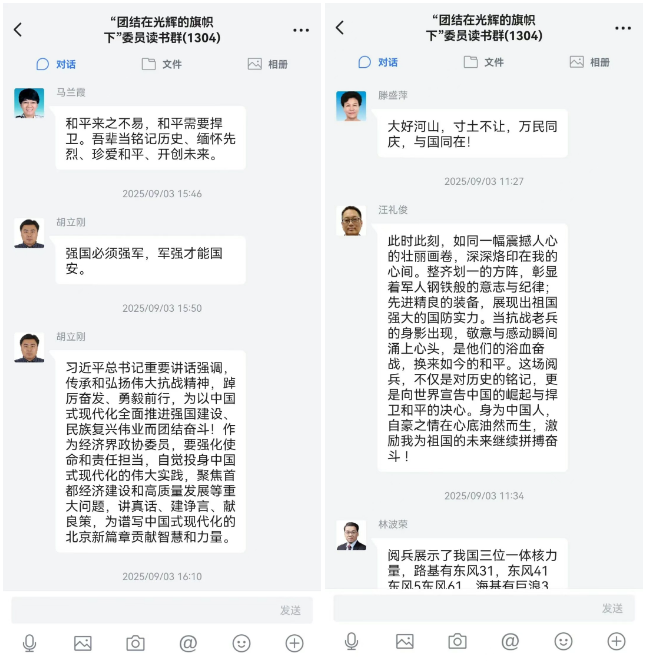 习近平总书记在纪念中国人民抗日战争暨世界反法西斯战争胜利80周年大会上的重要讲话,在北京市政协委员中引起强烈共鸣,大家倍感振奋、倍受鼓舞。为进一步激励和引导广大政协委员深入学习贯彻习近平总书记重要讲话精神,按照市政协党组的要求,市政协第一时间在委员履职平台“京华书院·团结在光辉的旗帜下”读书群,开展学习贯彻习近平总书记在纪念中国人民抗日战争暨世界反法西斯战争胜利80周年大会上的重要讲话精神专题读书活动,各界政协委员踊跃参与、畅谈体会,掀起了一股抒发爱国情怀、凝聚奋进共识的热潮。