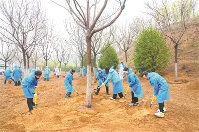 植树现场,大家挥锹铲土、培土围堰、提水浇灌,栽植下白皮松、元宝枫、栾树、流苏、楸树、榆叶梅、紫丁香等乔灌木,为初春的北京增添勃勃生机。