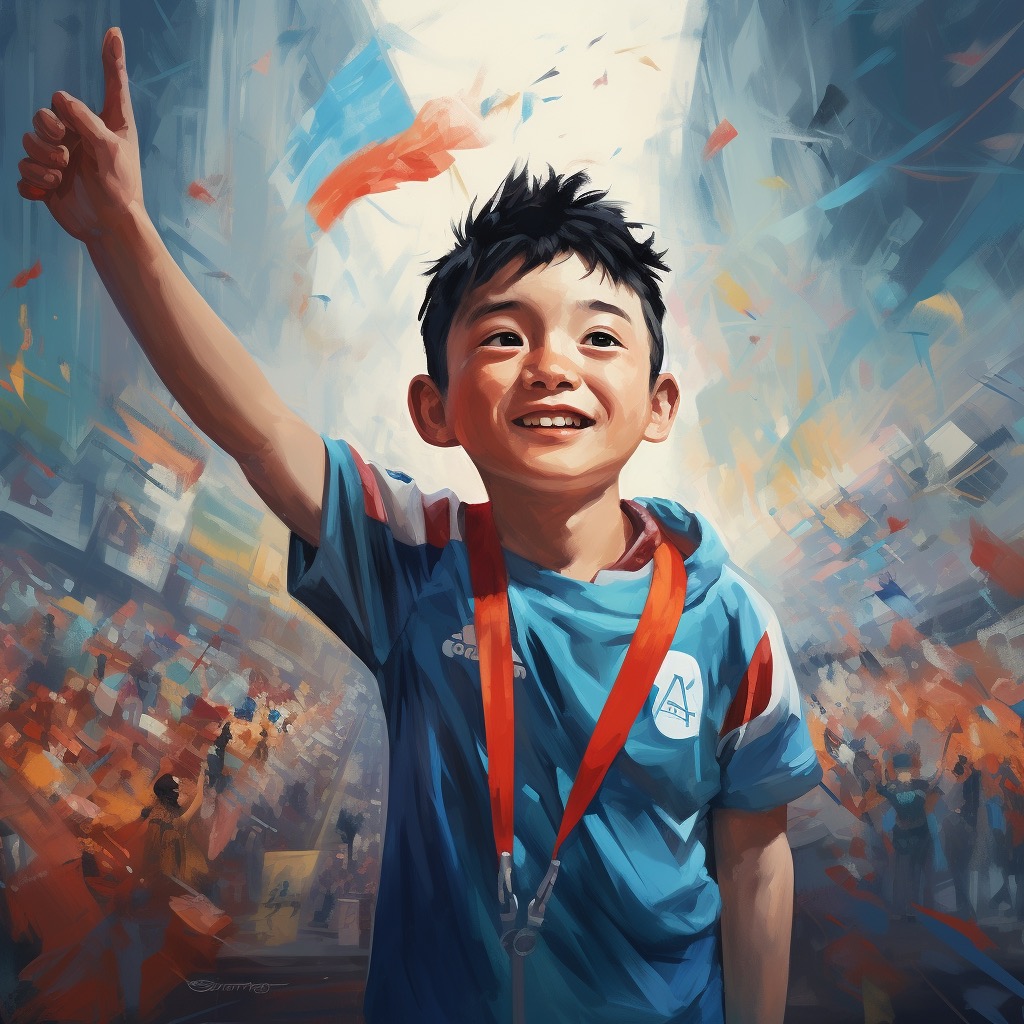 作品画的是一个小男孩梦想成真的故事。一个小男孩在年幼时期种下夺取冠军为国争光的种子,并在2023年杭州亚运会梦想成真。夺得桂冠的这一刻,仿佛当年那个怀揣梦想的孩子又重现在亚运会比赛现场。